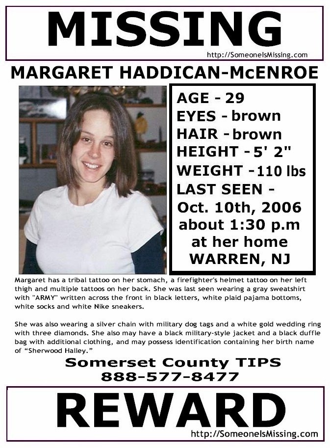 Army veteran, Margaret Haddican-McEnroe, of Warren, New Jersey disappeared on October 9th, 2006. The Federal Bureau of Investigation (FBI) announced on June 6, 2011, that Margaret’s husband Tim McEnroe is a person of interest. Per the FBI: “anyone with information regarding this investigation contact the Somerset County Prosecutor’s Office Major Crimes Squad at 908-231-7100, the FBI at 973-792-3000, or the Warren Township Police Department at 908-753-1000. All calls are confidential.”