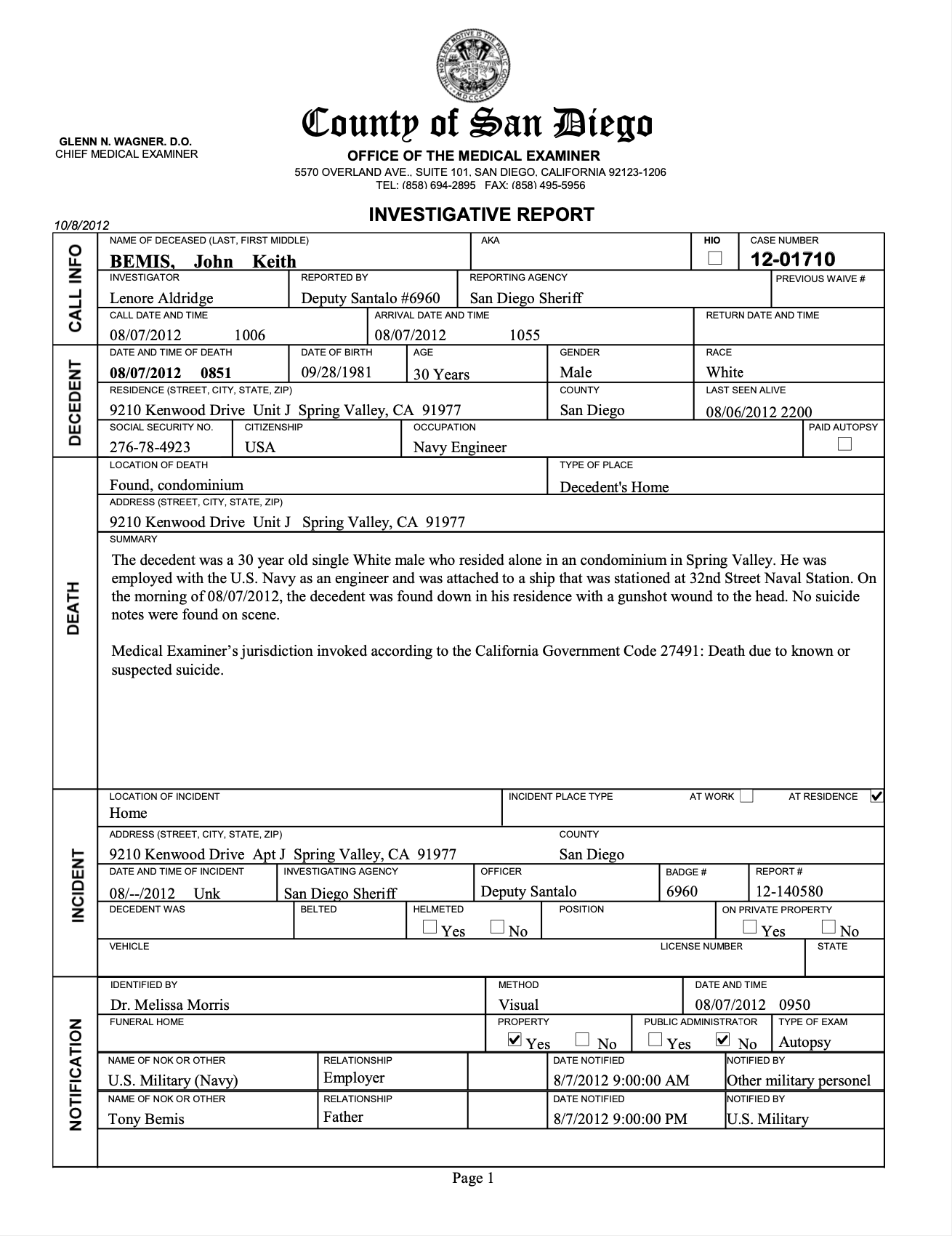 Navy CPO John Keith Bemis Found Dead in California Residence; Death Ruled Suicide But Totality of Evidence Suggests Homicide (August 7, 2012)
