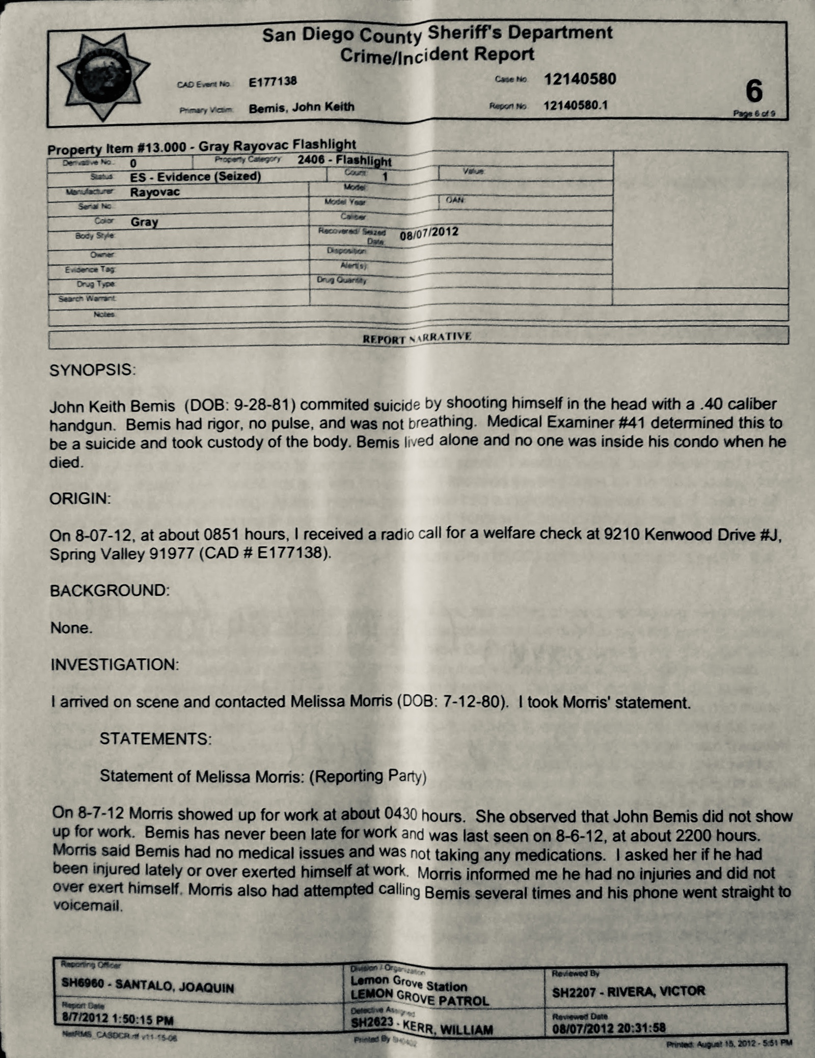 Navy CPO John Keith Bemis Found Dead in California Residence; Death Ruled Suicide But Totality of Evidence Suggests Homicide (August 7, 2012)