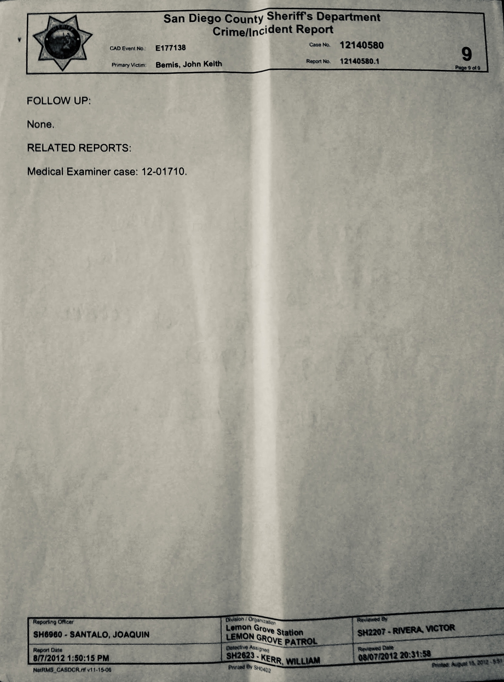 Navy CPO John Keith Bemis Found Dead in California Residence; Death Ruled Suicide But Totality of Evidence Suggests Homicide (August 7, 2012)