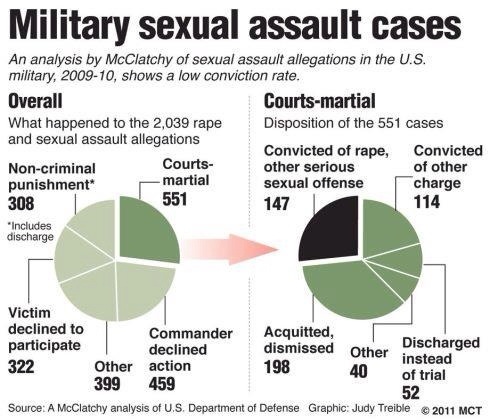 These are the numbers for 2009-10. We are now up to an estimated 26,300 sexual assaults per year yet only 3,374 reports by military members. The DoD tells us there has been a 50% increase in reporting. This may be attributed to both an increase in crimes and reporting. We are still left with a broken justice system that prosecutes far less complaints than they receive. The civilian prosecution rate for sexual assault is about 40% whereas the military prosecution rate is less then 10%.