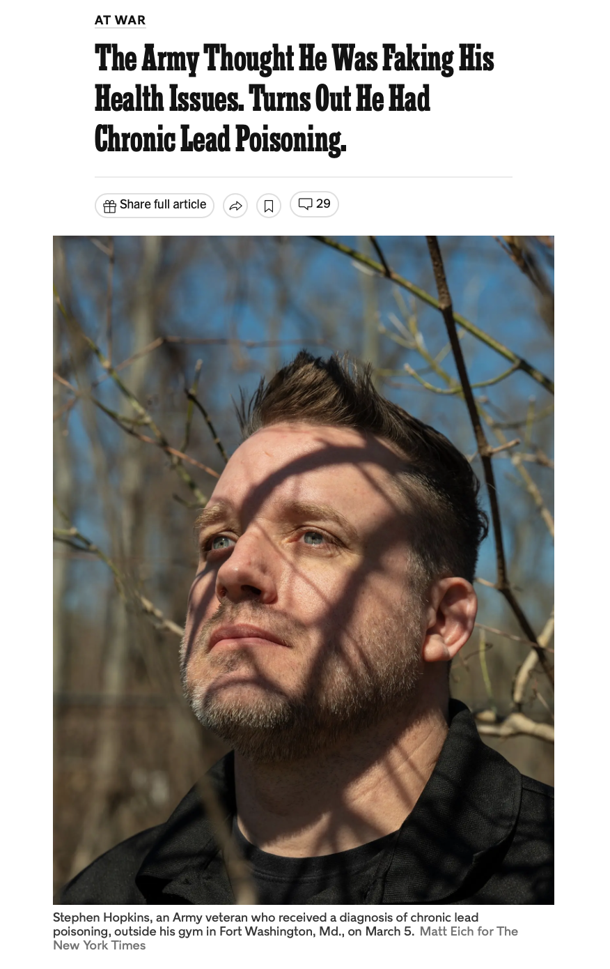 Read more from the NY Times here: The Army Thought He Was Faking His Health Issues. Turns Out He Had Chronic Lead Poisoning.