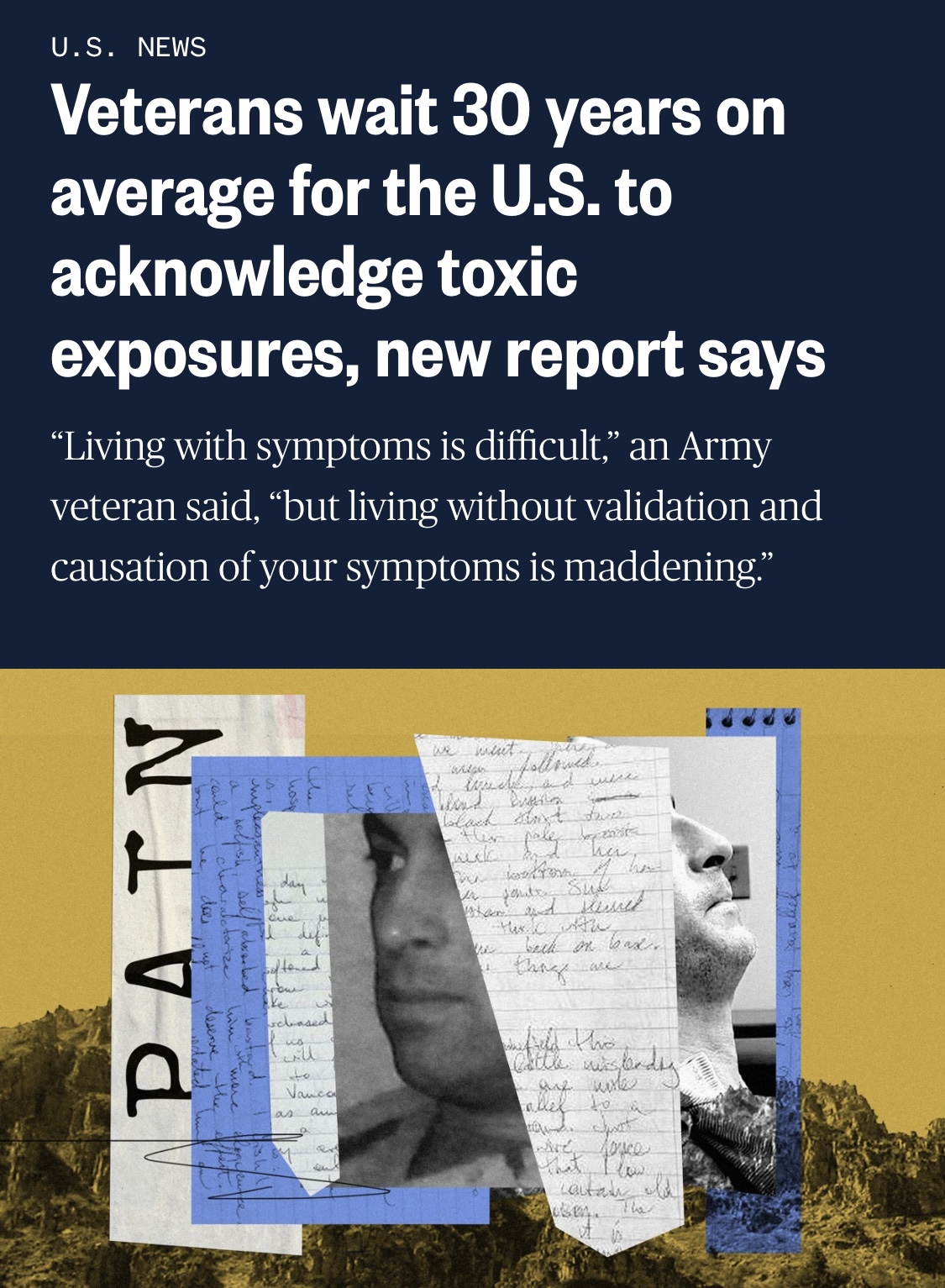 “A report released Wednesday found that sick veterans have waited an average of 31.4 years from when they first made contact with dangerous toxins on duty to when the government acknowledged they were exposed.”