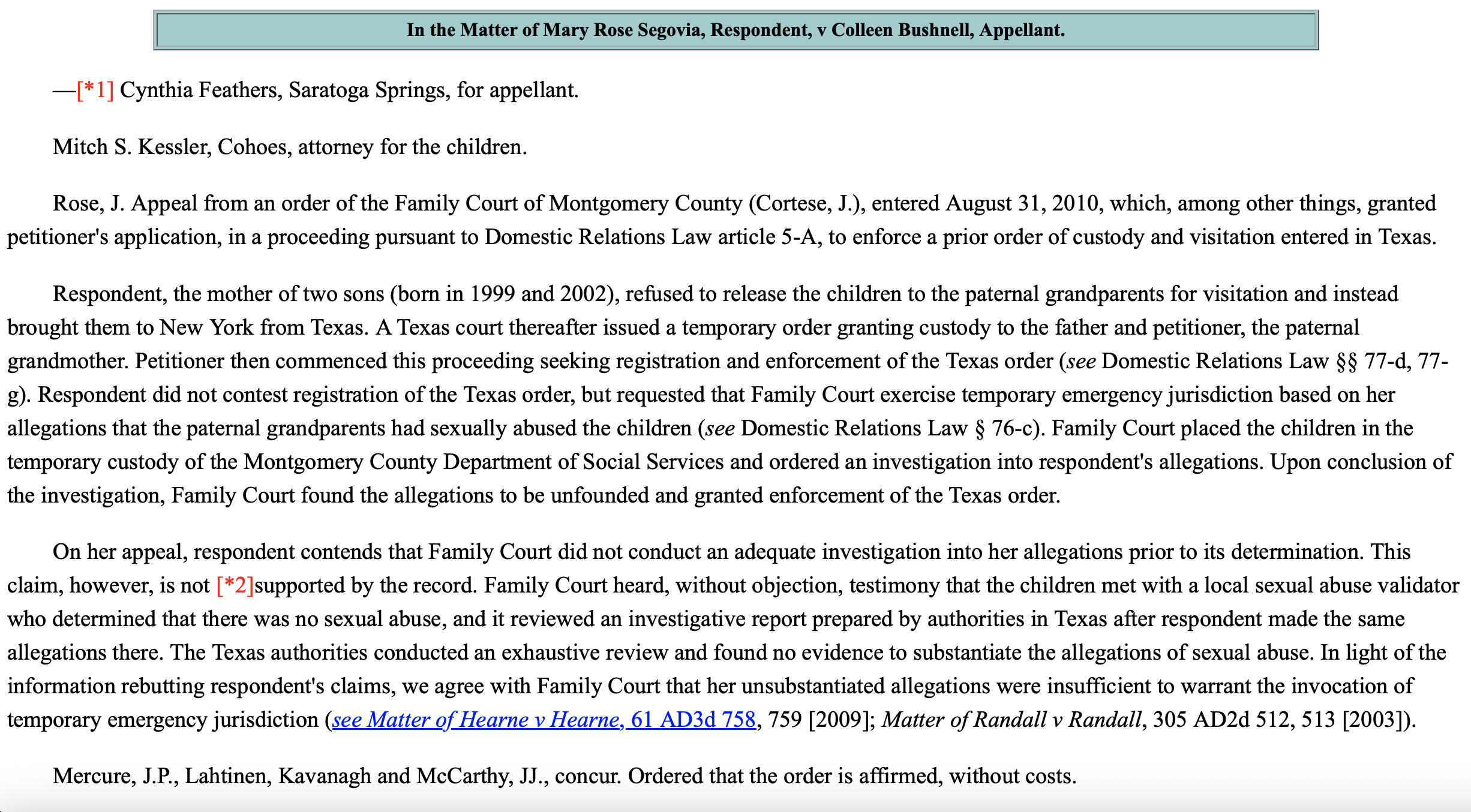 Respondent, the mother of two sons (born in 1999 and 2002), refused to release the children to the paternal grandparents for visitation and instead brought them to New York from Texas. A Texas court thereafter issued a temporary order granting custody to the father and petitioner, the paternal grandmother. Petitioner then commenced this proceeding seeking registration and enforcement of the Texas order (see Domestic Relations Law §§ 77-d, 77-g). Respondent did not contest registration of the Texas order, but requested that Family Court exercise temporary emergency jurisdiction based on her allegations that the paternal grandparents had sexually abused the children (see Domestic Relations Law § 76-c). Family Court placed the children in the temporary custody of the Montgomery County Department of Social Services and ordered an investigation into respondent’s allegations. Upon conclusion of the investigation, Family Court found the allegations to be unfounded and granted enforcement of the Texas order.