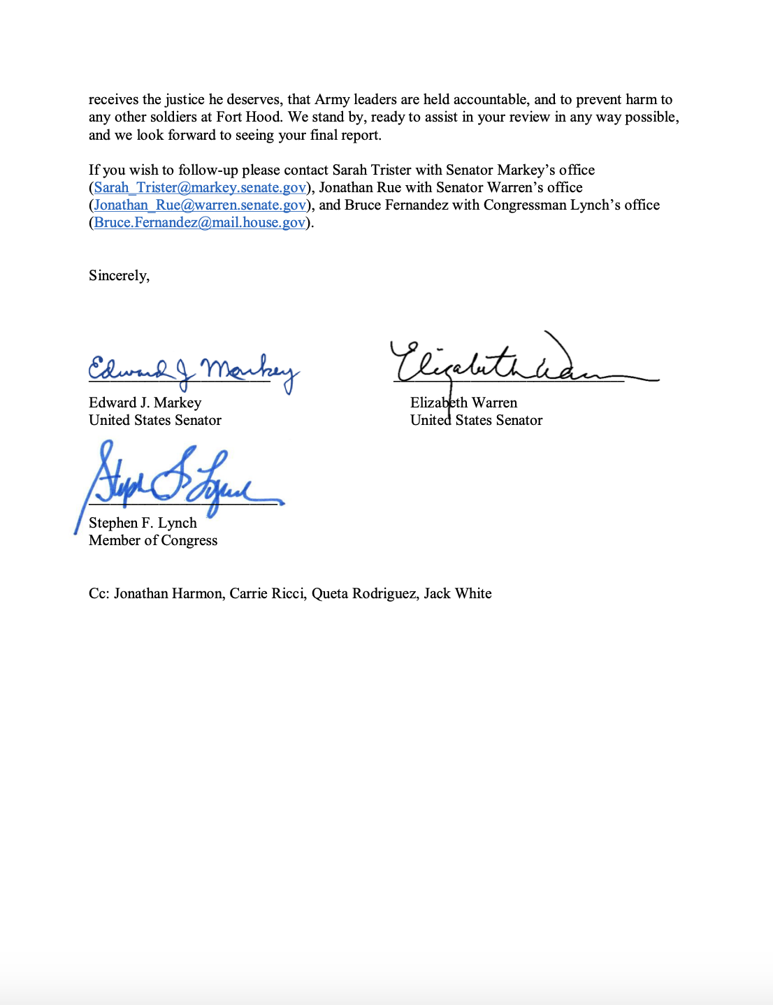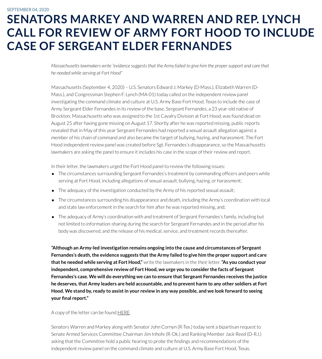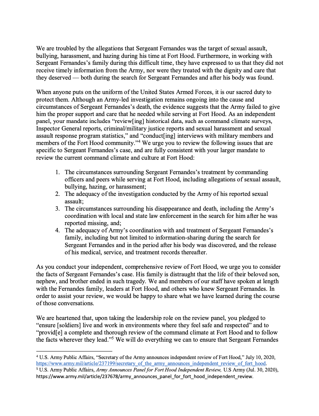 Open Letter to House of Representatives in Support of an Independent Investigation of the Murder of Vanessa Guillen at Fort Hood (July 7, 2020)