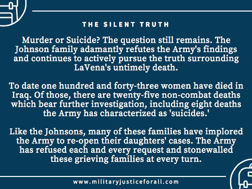 Ninety-four US military women in the military have died in Iraq or during Operation Iraqi Freedom (OIF). ‘The Silent Truth’ tells the story of one of these women, PFC LaVena Lynn Johnson, who was found dead on Balad Air Force Base in Iraq. The army claimed she shot herself with her own M16 rifle, but forensic evidence, obtained by the Johnson family through the Freedom of Information Act, brings the army’s findings into question. The Army refuses to re-open LaVena Johnson’s case, leaving the family in limbo. ‘The Silent Truth’ follows the Johnson’s pursuit of justice and truth for their daughter. -The Silent Truth Documentary (July 1, 2014)